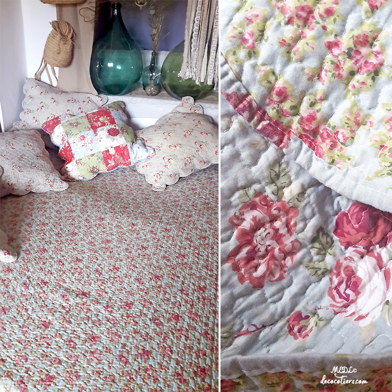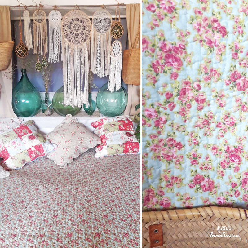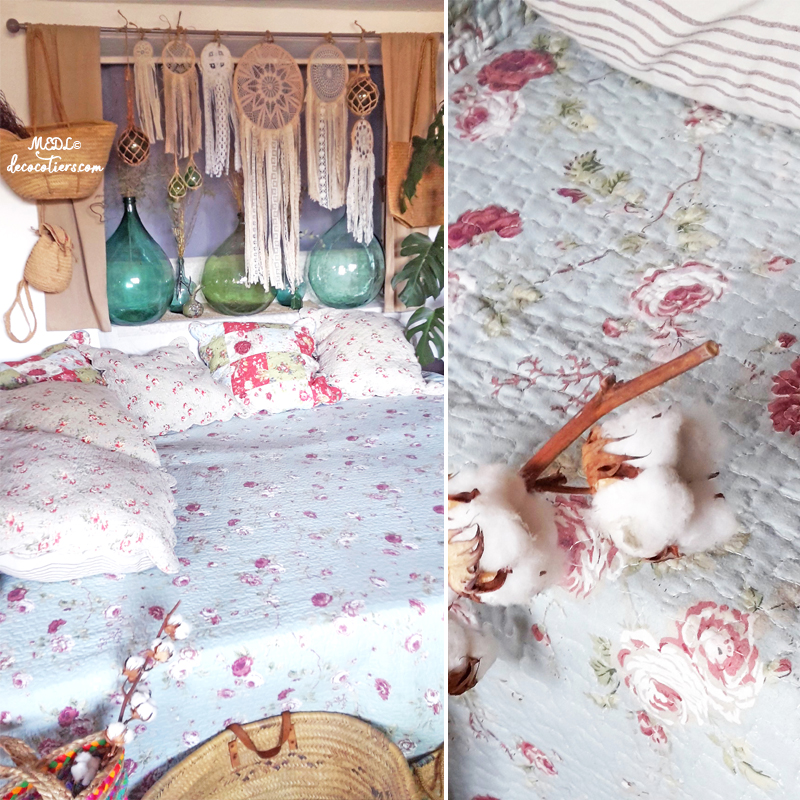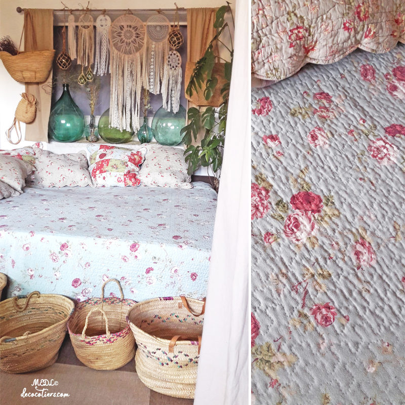 Immense boutis floral de style provençal, celui de la princesse au petit pois. Pour une déco bohème, pensez aux "Dames-Jeanne", attrapes rêves et paniers qui complètent le tableau. Tous les boutis Décocôtiers s'accordent parfaitement et ensemble créent le décor ! à cumuler dans une très ancienne armoire Louis Philippe au style désuet ! touche champêtre assurée !!! M.E.D.L